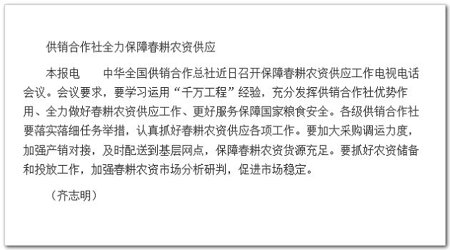 中華全國供銷合作總社近日召開保障春耕農(nóng)資供應(yīng)工作電視電話會議。會議要求,要學(xué)習(xí)運用“千萬工程”經(jīng)驗,充分發(fā)揮供銷合作社優(yōu)勢作用、全力做好春耕農(nóng)資供應(yīng)工作、更好服務(wù)保障國家糧食安全。各級供銷合作社要落實落細(xì)任務(wù)舉措,認(rèn)真抓好春耕農(nóng)資供應(yīng)各項工作。要加大采購調(diào)運力度,加強產(chǎn)銷對接,及時配送到基層網(wǎng)點,保障春耕農(nóng)資貨源充足。要抓好農(nóng)資儲備和投放工作,加強春耕農(nóng)資市場分析研判,促進(jìn)市場穩(wěn)定。